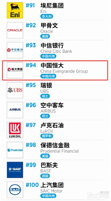 5月16日,福布斯發(fā)布全球企業(yè)2000強排行榜,中國恒大位列榜單第94位。