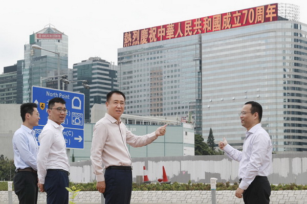 獻(xiàn)禮新中國成立70周年!恒大香港總部大樓打出慶祝標(biāo)語 許家印現(xiàn)場檢查