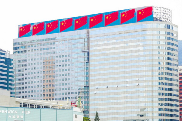 恒大香港總部大樓位于港島核心區(qū)域,其頂樓的LED屏高10米、長110米,是香港最大、最長的巨幅LED屏。早在8月開始,恒大利用總部大樓LED屏,展示出一排五星紅旗在維港上空迎風(fēng)飄揚。今天開始,五星紅旗與慶祝國慶標(biāo)語交替出現(xiàn),成為維港天際線最絢麗奪目的一道風(fēng)景。